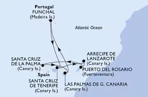 Zbor potnikov na letališču JP v Ljubljani, prijava na let in polet proti Kanarskim otokom. Po pristanku sledi vožnja do pristanišča v glavnem mestu otoka. Po prihodu v pristanišče bomo kovčke oddali ladijskemu osebju, nato pa se vkrcali na ladjo MSC Musica, ki bo naše domovanje v naslednjem tednu. Prosti čas za spoznavanje ladje, kosilo in sproščanje. Pred izplutjem je obvezna reševalna vaja za vse potnike na ladji (navodila dobite pred odhodom).